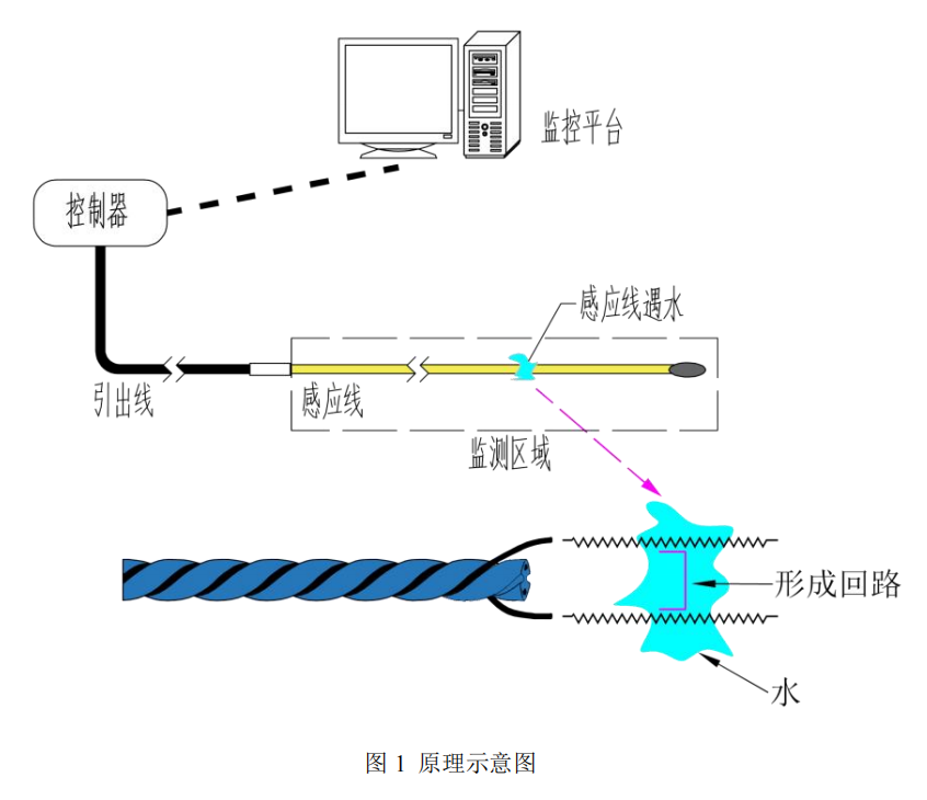 當(dāng)有液體與感應(yīng)線接觸時(shí),兩根感應(yīng)線內(nèi)芯線遇液體導(dǎo)通,形成回路,泄漏控制器檢測(cè)到泄漏情況,