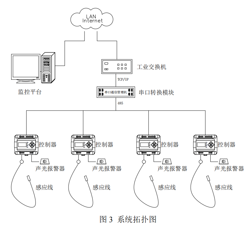 控制器與感應線連接,感應線安裝于漏液檢測區域,當發生液體泄漏時,觸發控制器報警及繼電器動作,通過 RS485 信號上傳泄漏數據至監控平臺,精準定位,實現實時集中監控。控制器繼電器輸出信號可聯動控制外圍設備如聲光報警器、自動閥門與智能報警等設備。