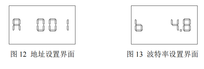 參數設置:長按 MENU 鍵參數設置界面,按一次 MENU 鍵切換參數(通訊地址、波特率),輕