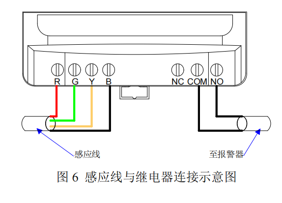 YEC-MM-A 控制器的繼電器觸點可用于本地或遠程報警,或聯動控制閥門等其它裝置,也可與控制自動化系統觸點輸入連接。繼電器僅針對泄漏報警工作,具有常開、常閉兩種狀態,用戶可自由選擇接出方式。在整個泄漏檢測系統中,引出線用于連接控制器和泄漏感應線。連接如下圖所示: