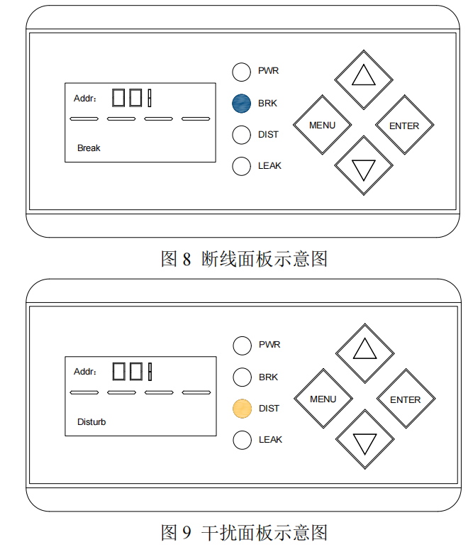控制器上有 4 個 LED,分別代表:運行、線纜故障、干擾報警、泄漏。控制器通電并正常運行時,