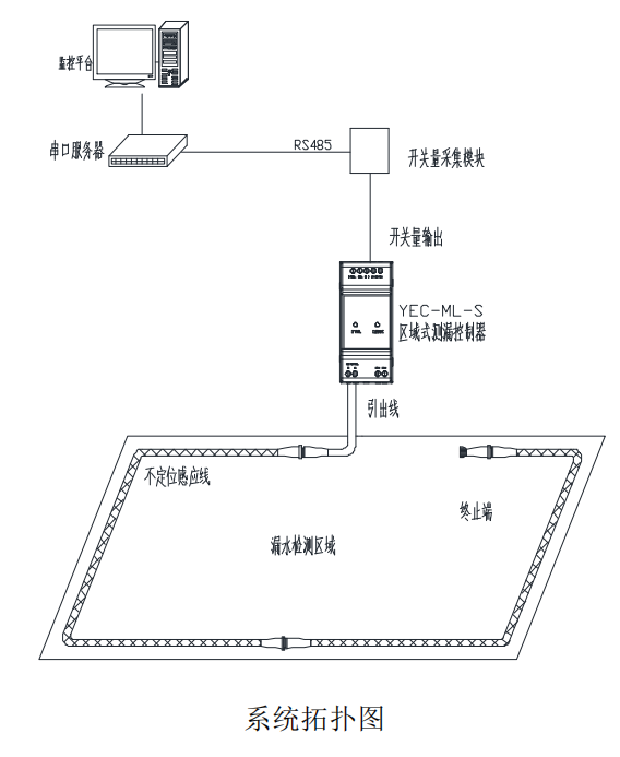 控制器 YEC-ML-S 與感應線連接,通過開關量信號輸出將泄漏情況數據匯集至開關量模塊,轉換成RS485 信號傳輸至上位機。控制器繼電器輸出信號可用來控制外圍設備如聲光報警器、電話撥號器、