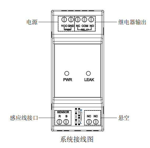 2. 取少量的自來水(非凈化處理水),將感應線浸沒于水中,一秒鐘后,繼電器動作,LEAK 指示
